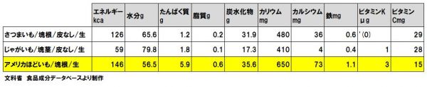 文科省 食品成分データベースに載っていましたので、ジャガイモ、さつまいもと比較。