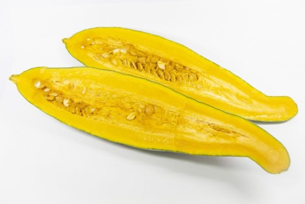 ヘチマのような長い形で、灰色がかった緑の不思議な皮色をしています。標高500m以上の盆地で寒暖差が大きく、独特の風味のあるカボチャができた理由なのかもしれません。