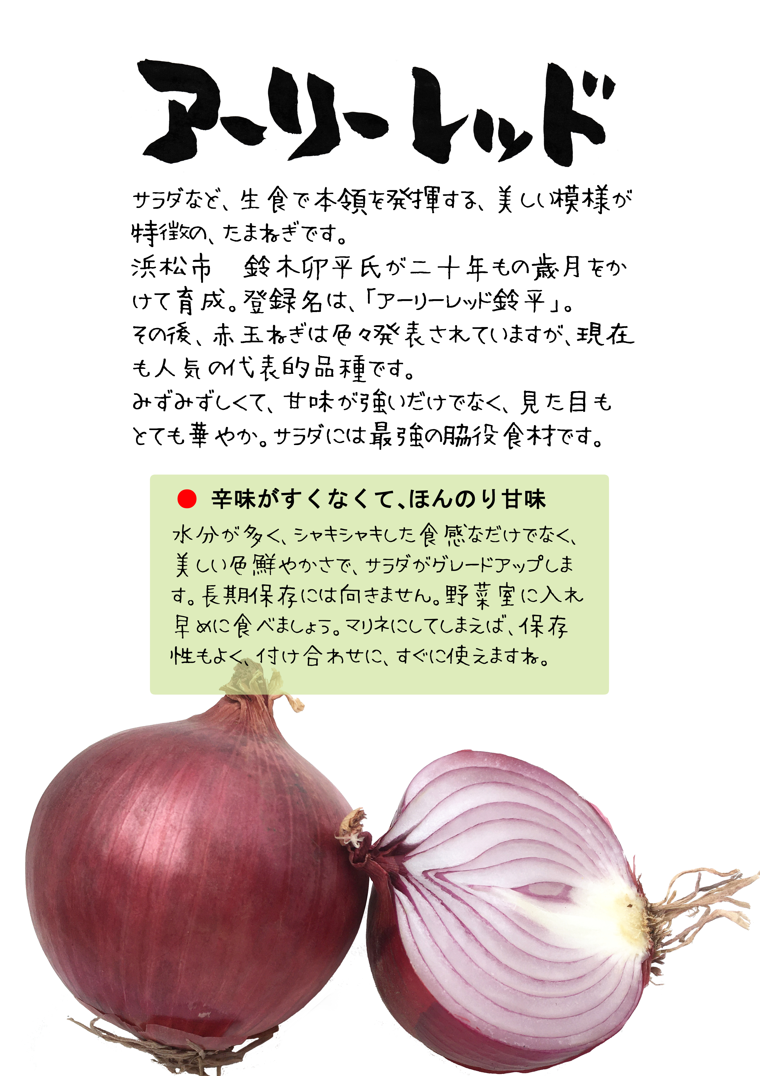この品種は、「湘南レッド」に「黄玉の早生系」、「岐阜レッド」、「猩々赤」等を自然交雑させて、選抜を重ねて育成した固定品種である。育成地(静岡県浜松市)において、4月に収穫可能な早生性の生食用赤タマネギである。・・・「湘南レッド」、「岐阜レッド」及び「猩々赤」と比較して、草たけが低いこと、収穫期が早いこと等で区別性が認められる。