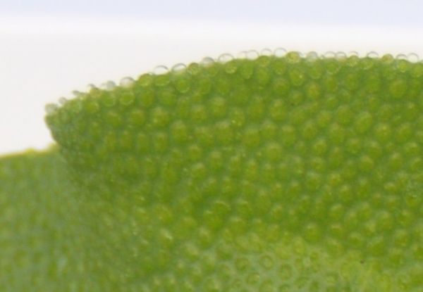 葉の表面に、「ブラッダー細胞」と呼ばれる、キラキラした粒が見られます。
