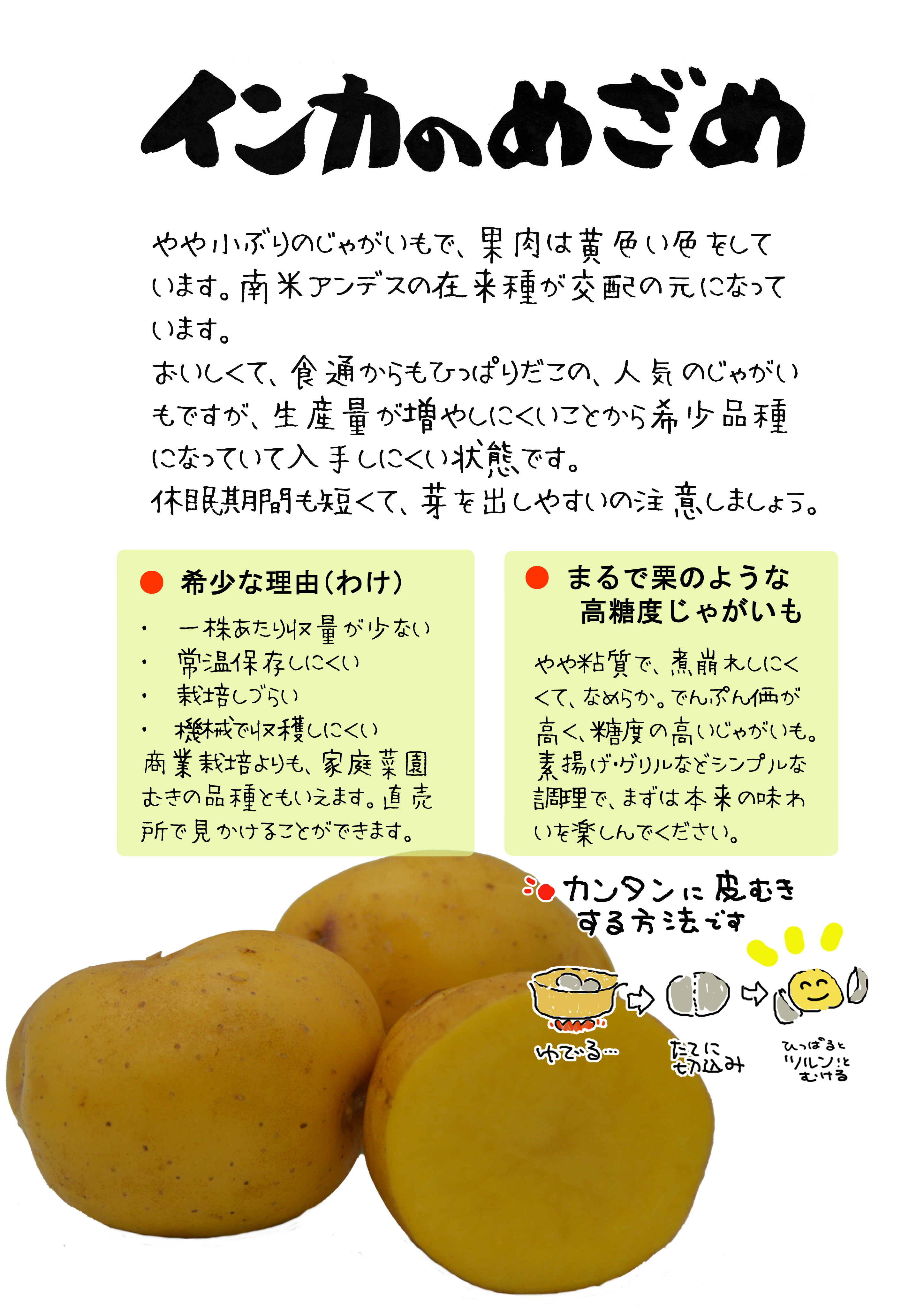 アンデス「インカ帝国」由来の品種ということ、新しくリリースした品種ということで、「インカ」の「めざめ」と名付けられたようです。