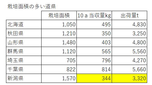 奇妙なのは、新潟県では栽培面積に対して、生産・出荷相当トン数が異常に少ないです。つまり、出荷してないのが多い。