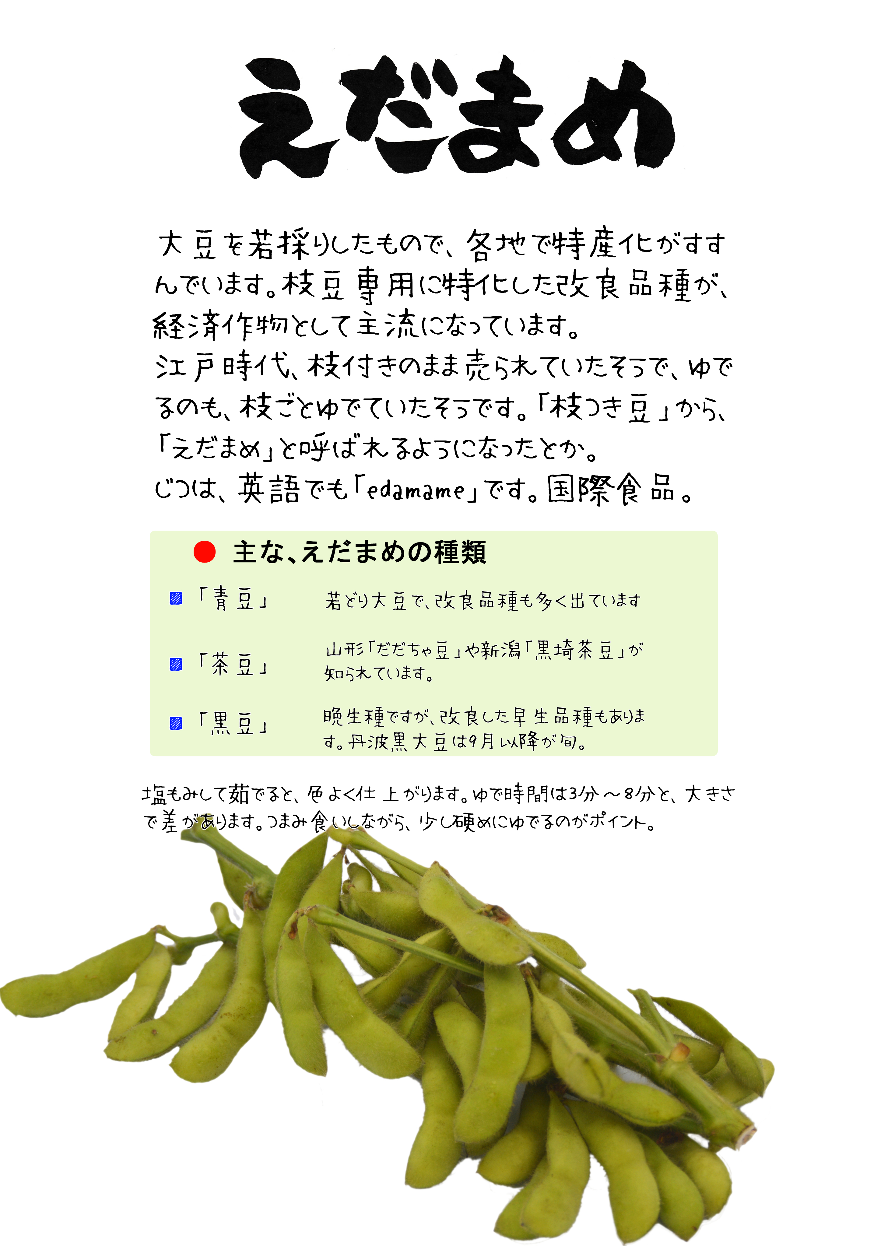 未成熟な大豆を食べる習慣は、アジア特有のものだったようで、英語でも「EDAMAME」。