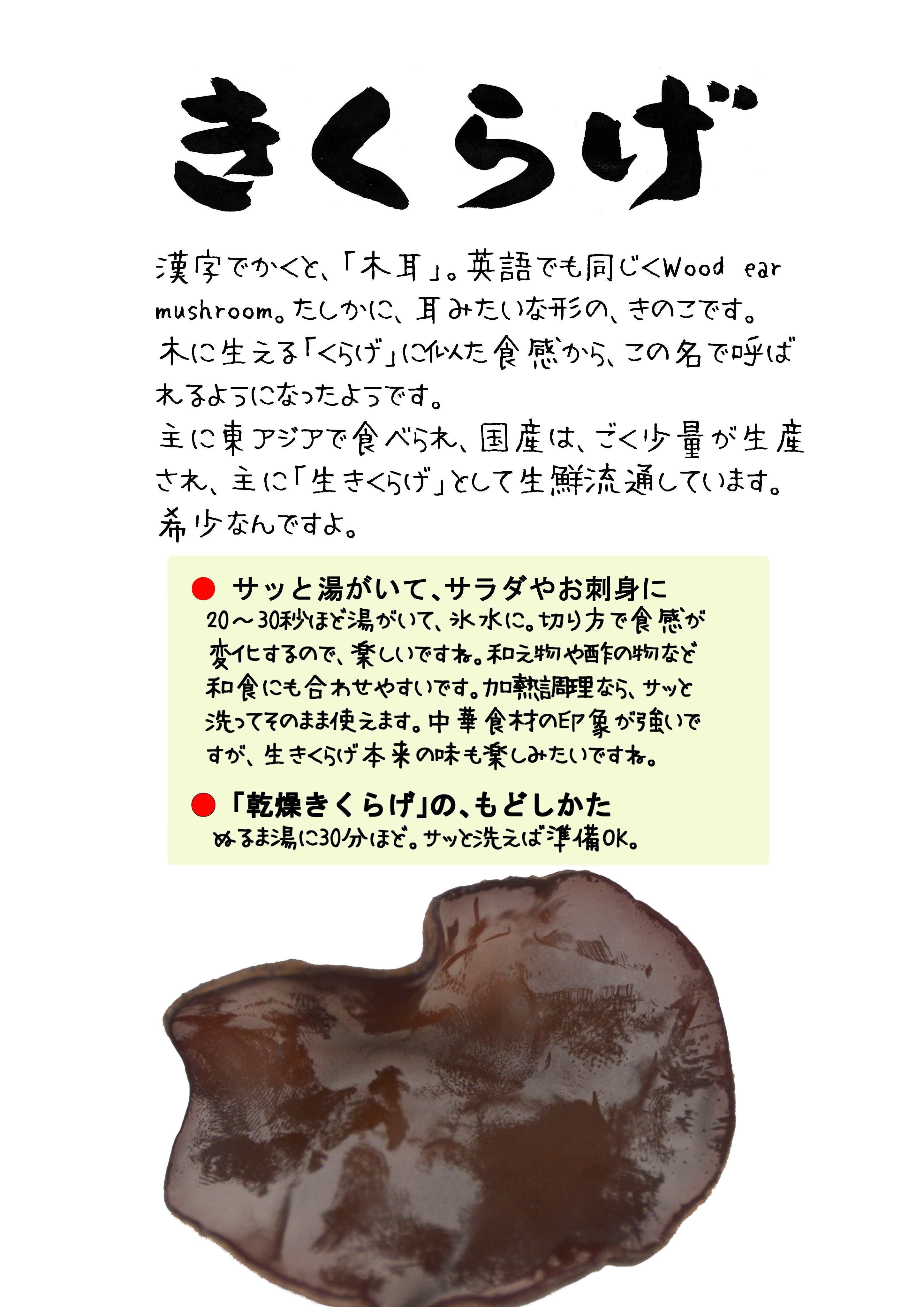 以前は、生きくらげを見つけると、おおッ、と釘付けになりましたが、直売所では案外よく見かけるようになりました。きくらげ特有の食感は、実に魅惑的ですね。