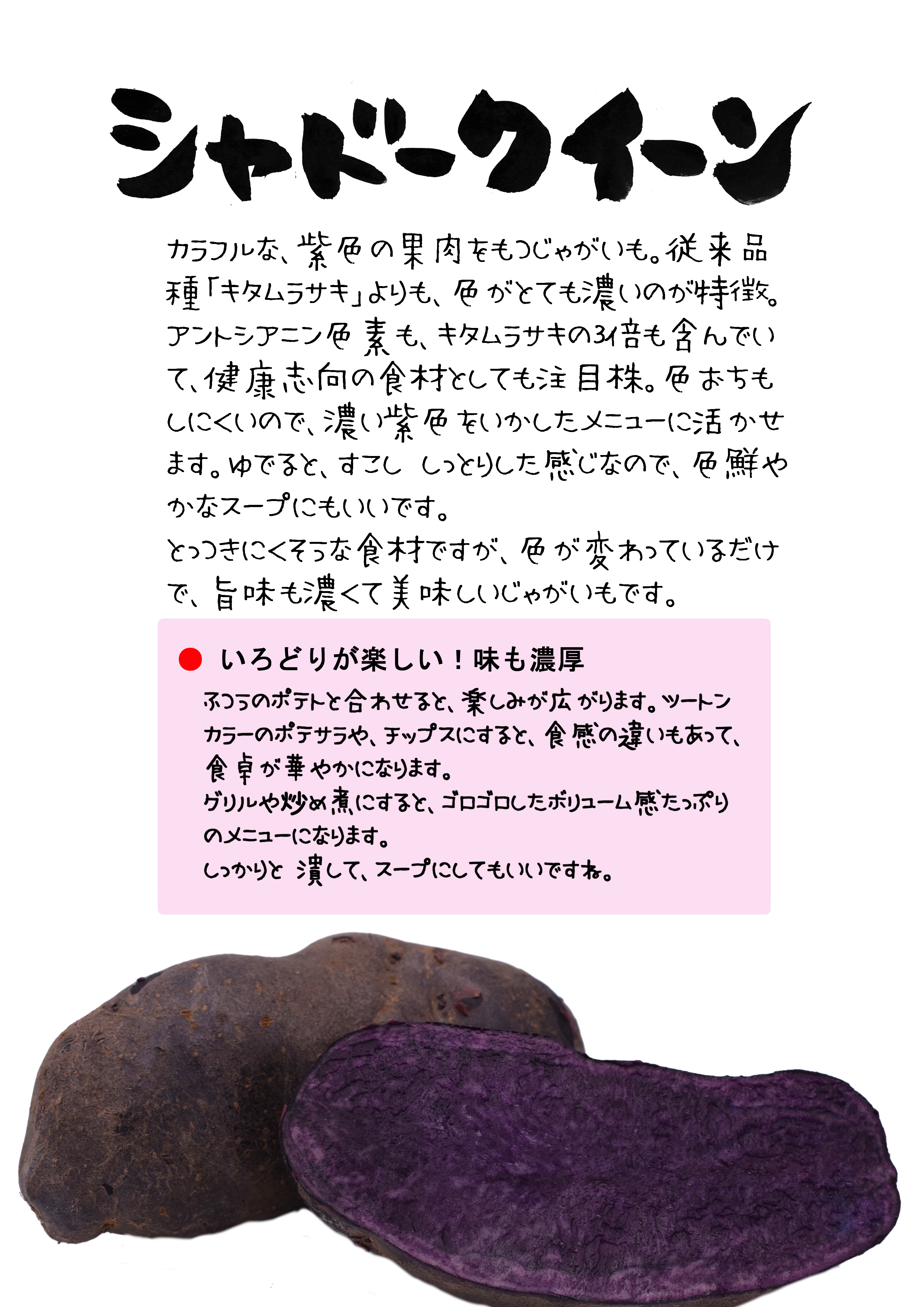 「ノーブルシャドー」は改良種で、「シャドークイーン」にはない、ジャガイモシストセンチュウ抵抗性があることから、今後産地では注目されるかもしれません。