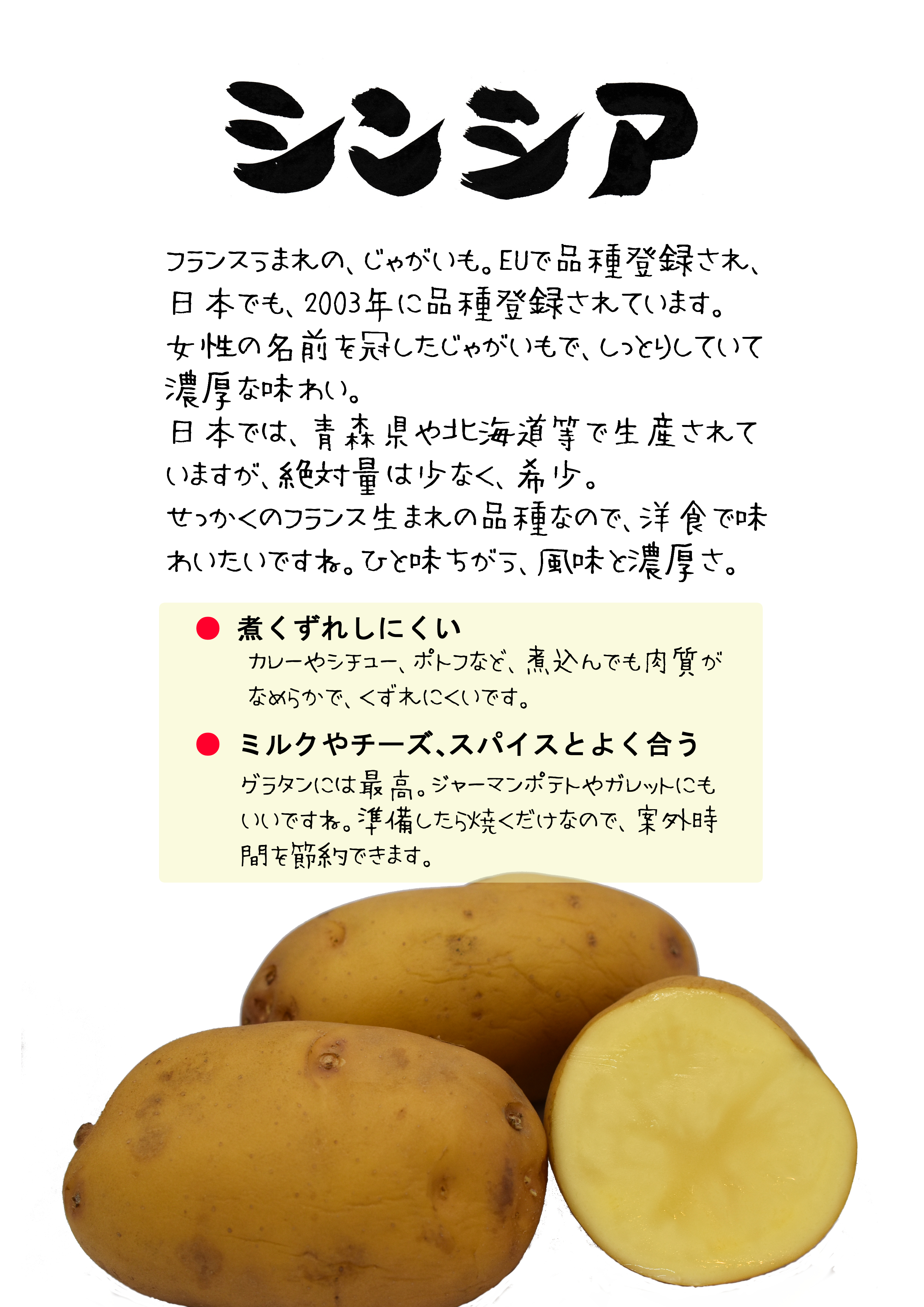 肉じゃが、煮物に向き、滑らかな食感が心地よいジャガイモです。