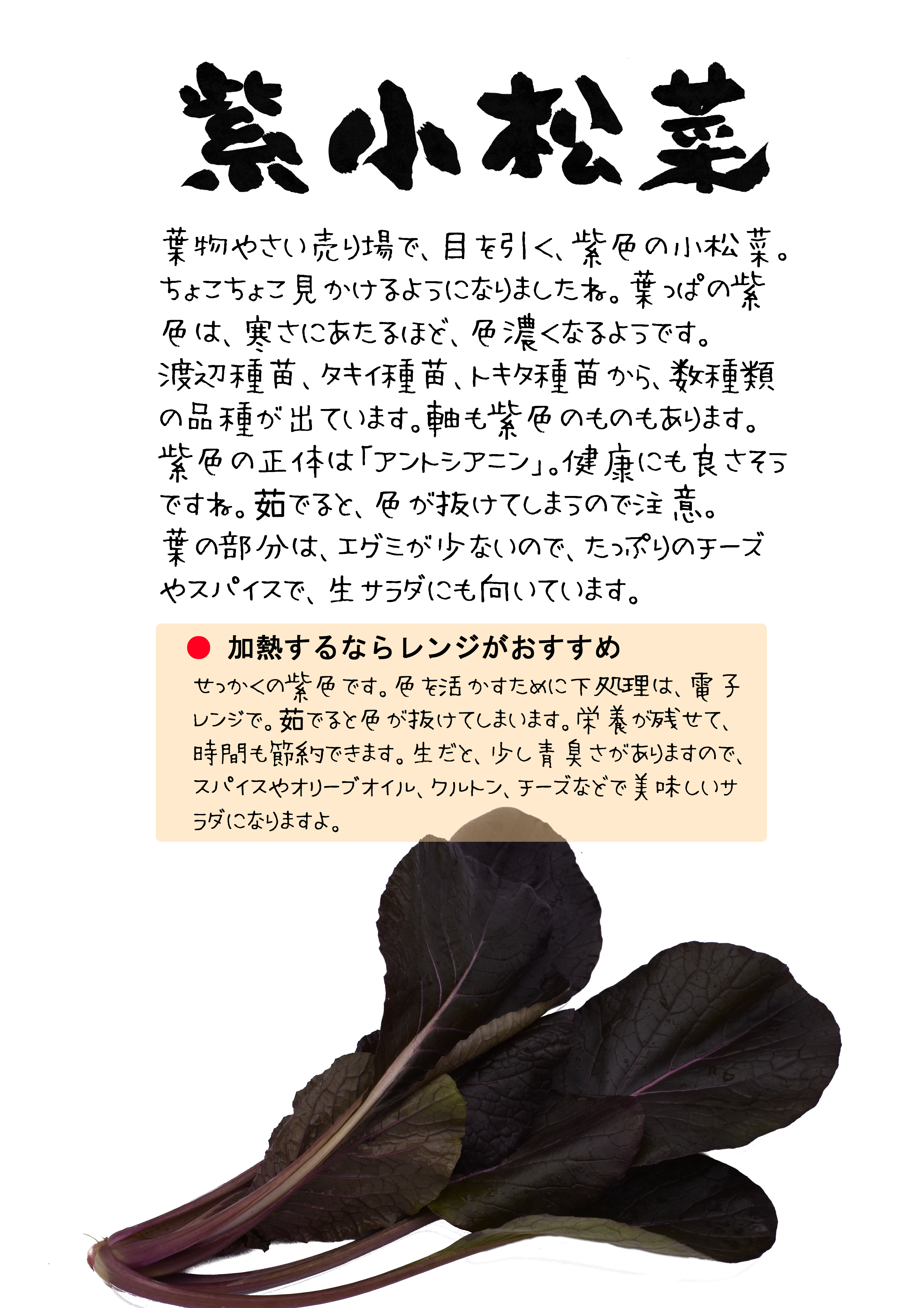 葉っぱが紫色であれば、「紫小松菜」として流通しているものです。