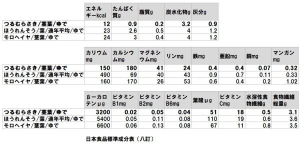 「つるむらさき」「ほうれんそう」「モロヘイヤ」の、茹でたもの100gの比較をしてみます。