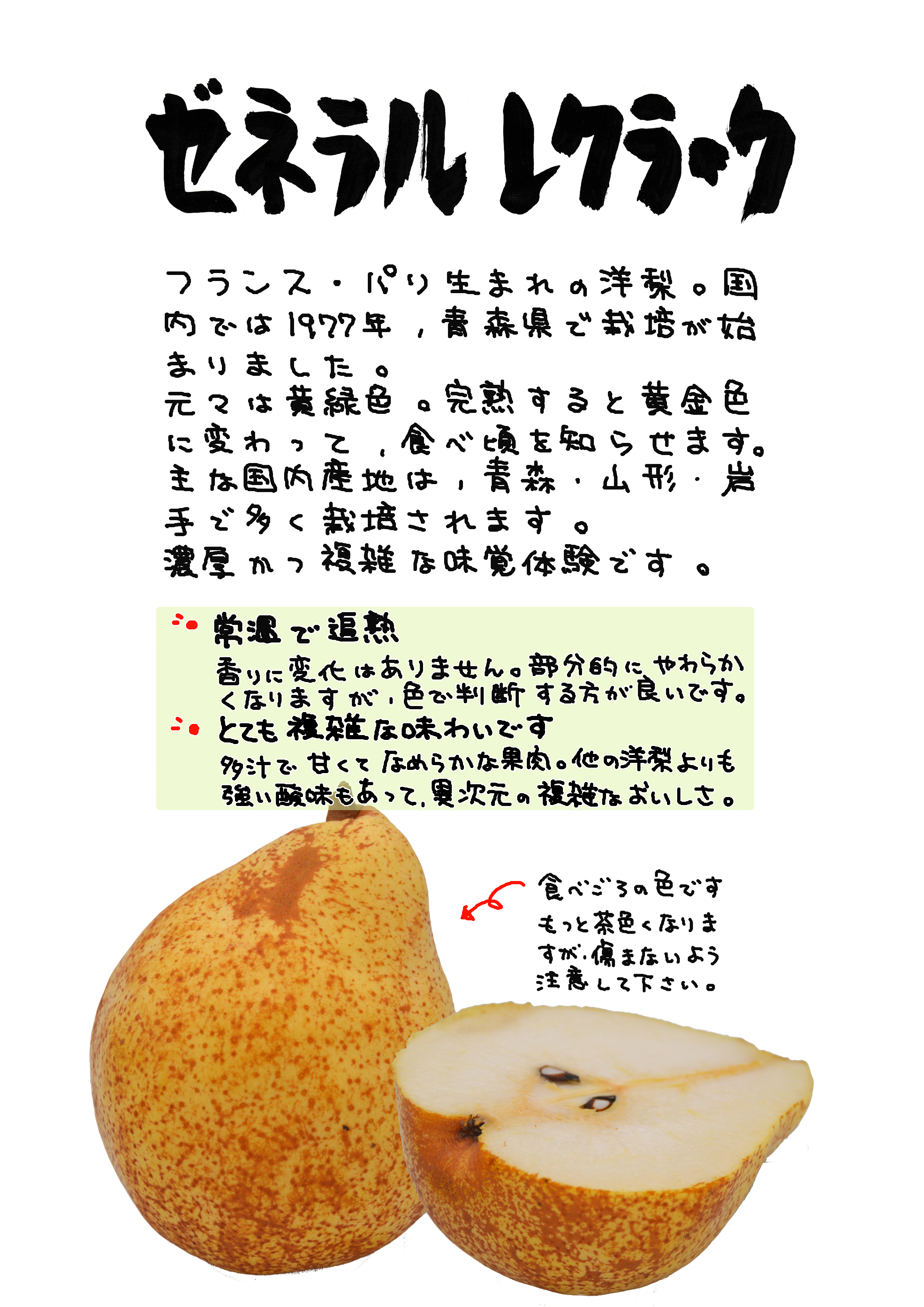 地域によって酸味の度合いは異なるそうです。食感もいい。長野県で入手。ドワイエネ・デュ・コミスの自然交雑実生のようです。年に何度か食べたい洋梨のひとつです。
