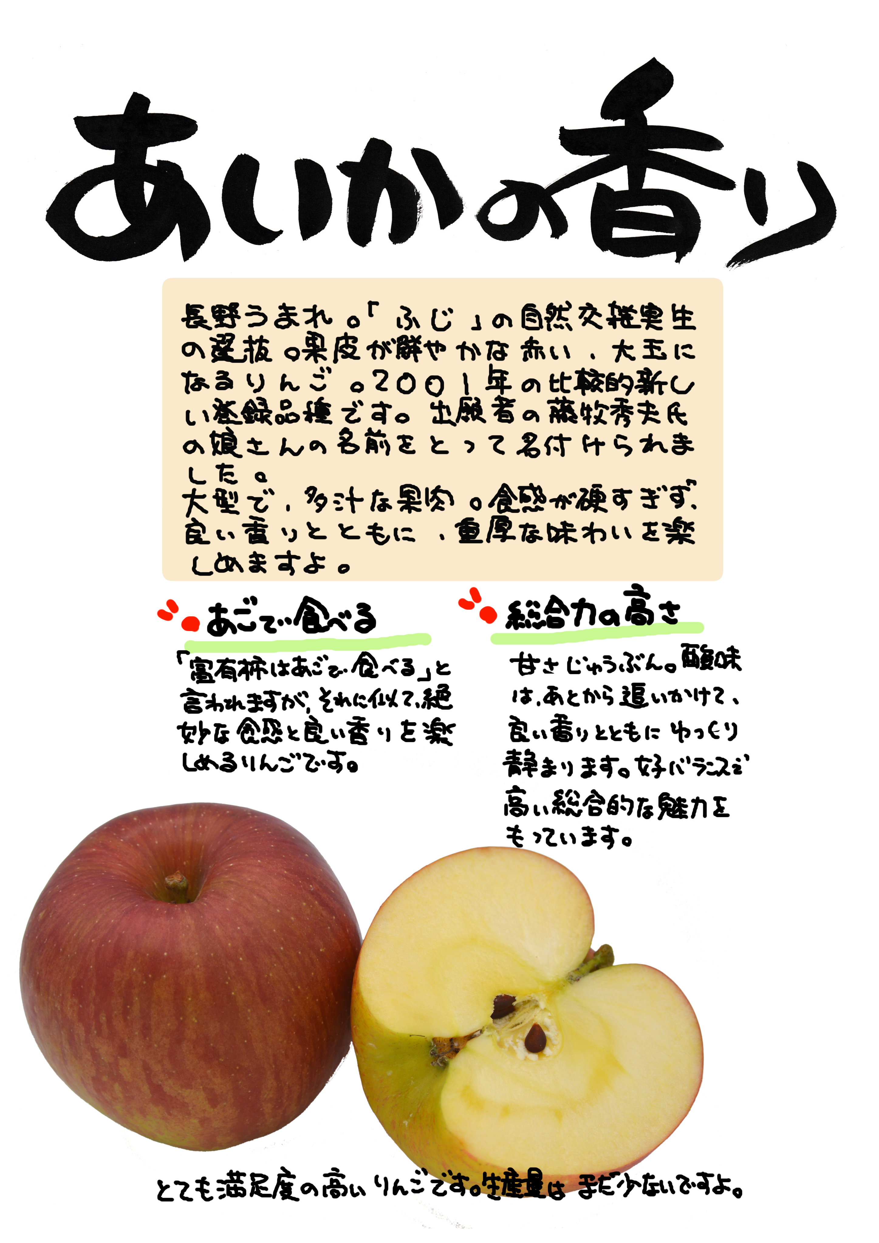 「あいかの香り」は、昭和47年に当農園で自然交雑した「ふじ」の種約200個を播き、良いものを選抜しその中の1本から平成4年に初めて結実しました。その後調査を続け有望品種という事で、平成10年1月に農水省へ種苗登録の出願、平成13年7月に「あいかの香り」として登録されました。