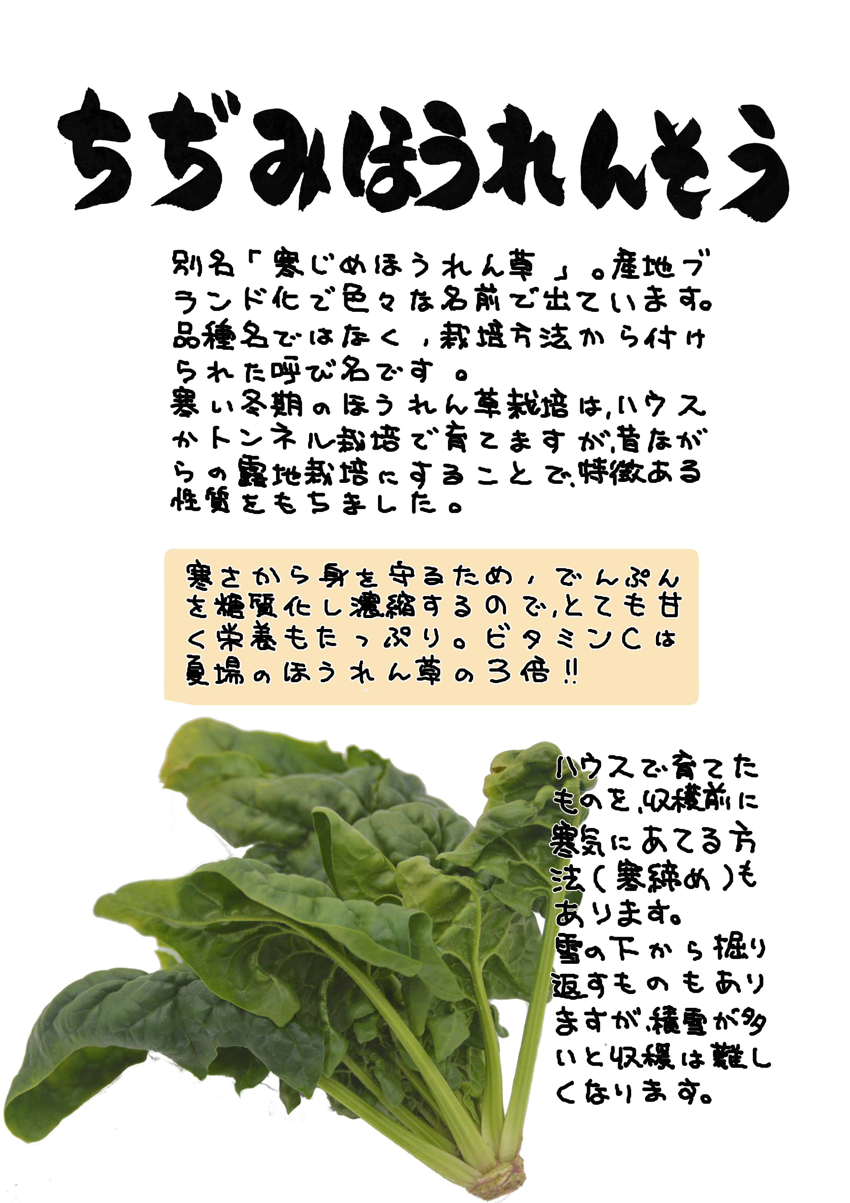 寒締め系で、チリチリの縮緬状になった青菜には、雪菜、仙台雪菜もあります。