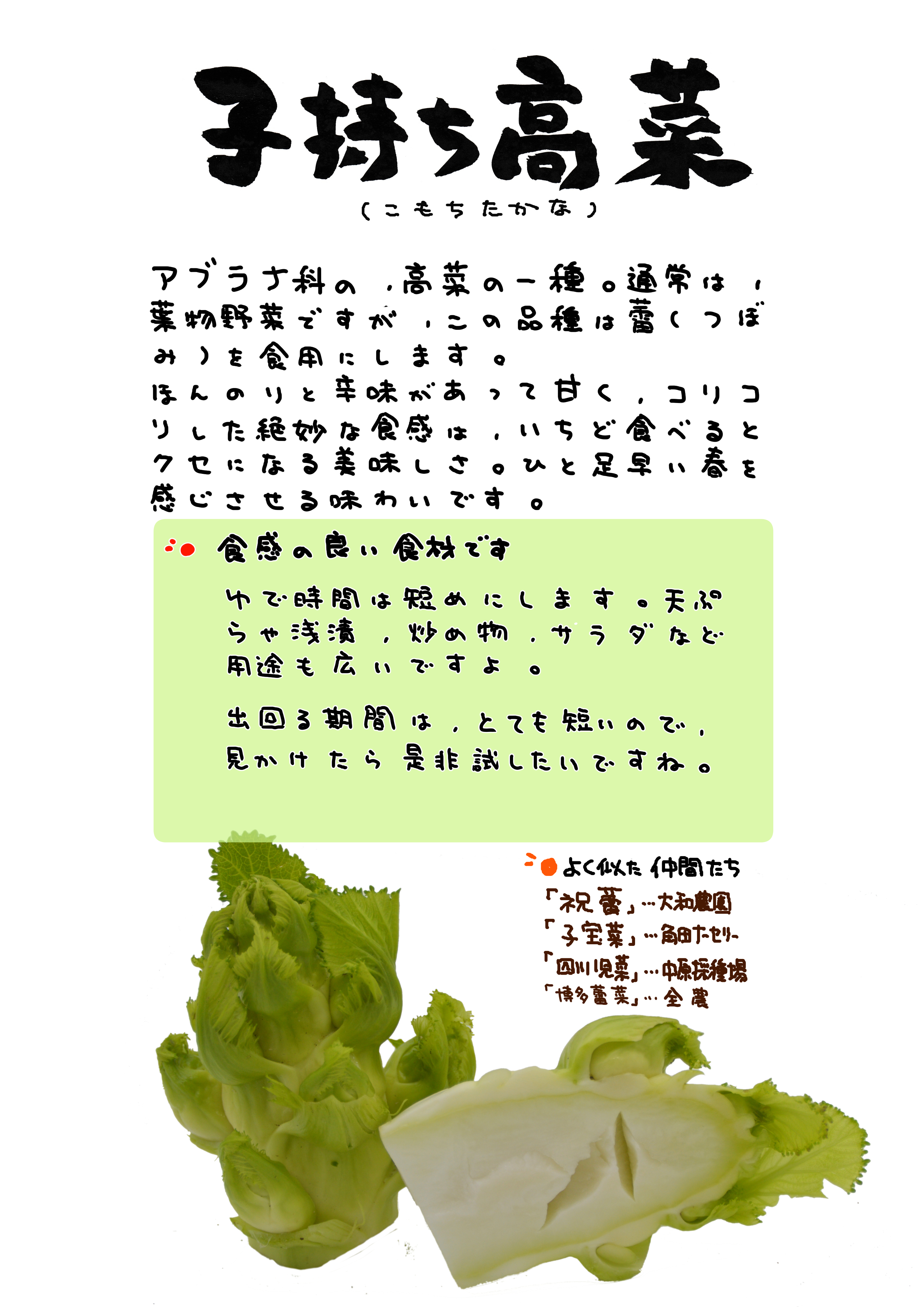 ○食用部分は、蕾の形に似たわき芽を若穫り。また、葉も高菜同様食べられる。