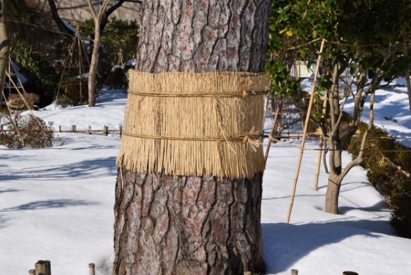 冬の樹木にまかれている、害虫から木を守る、冬ごもりの準備物「こも」。