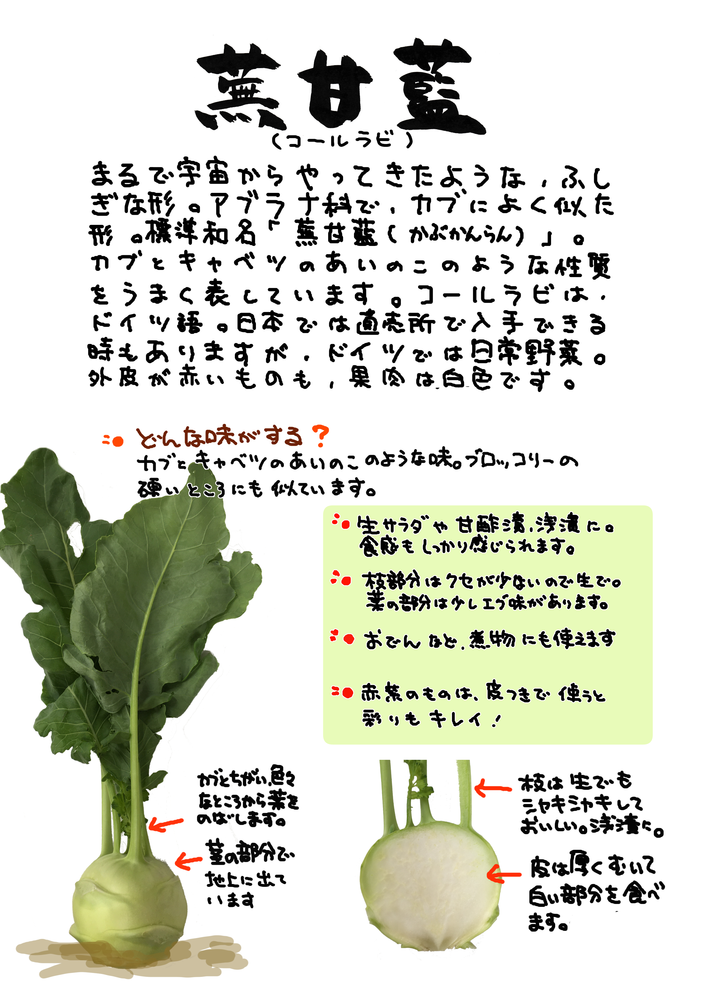 コールラビのほうが通り名かと思います。カブのようでカンラン(キャベツ)のようというのも上手い表現です。ほんのり甘さもあって、用途も意外に広いんです。