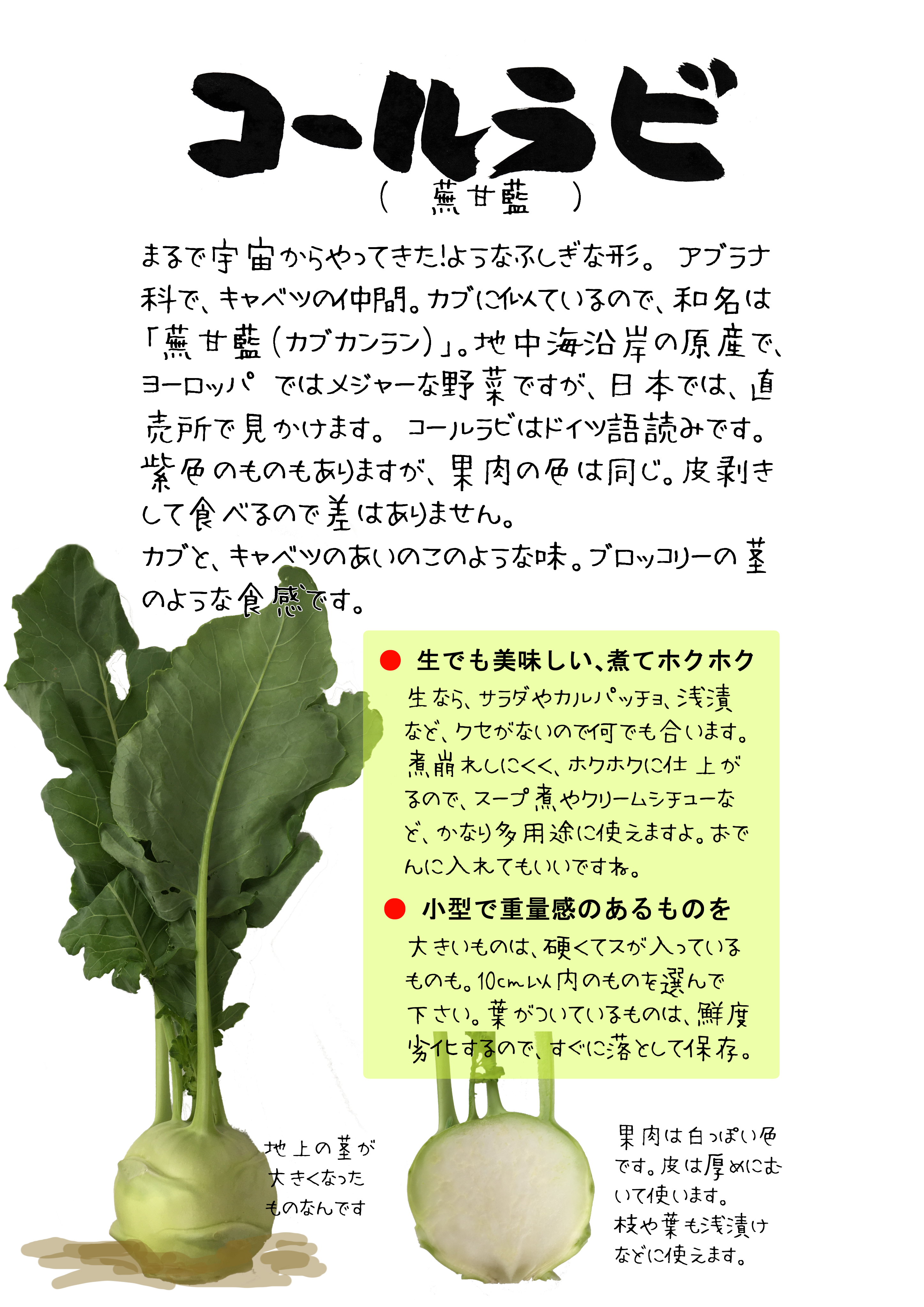 蕪甘藍よりコールラビのほうが通り名かと思います。カブのようでカンラン(キャベツ)のようというのも上手い表現です。ほんのり甘さもあって、用途も意外に広いんです。