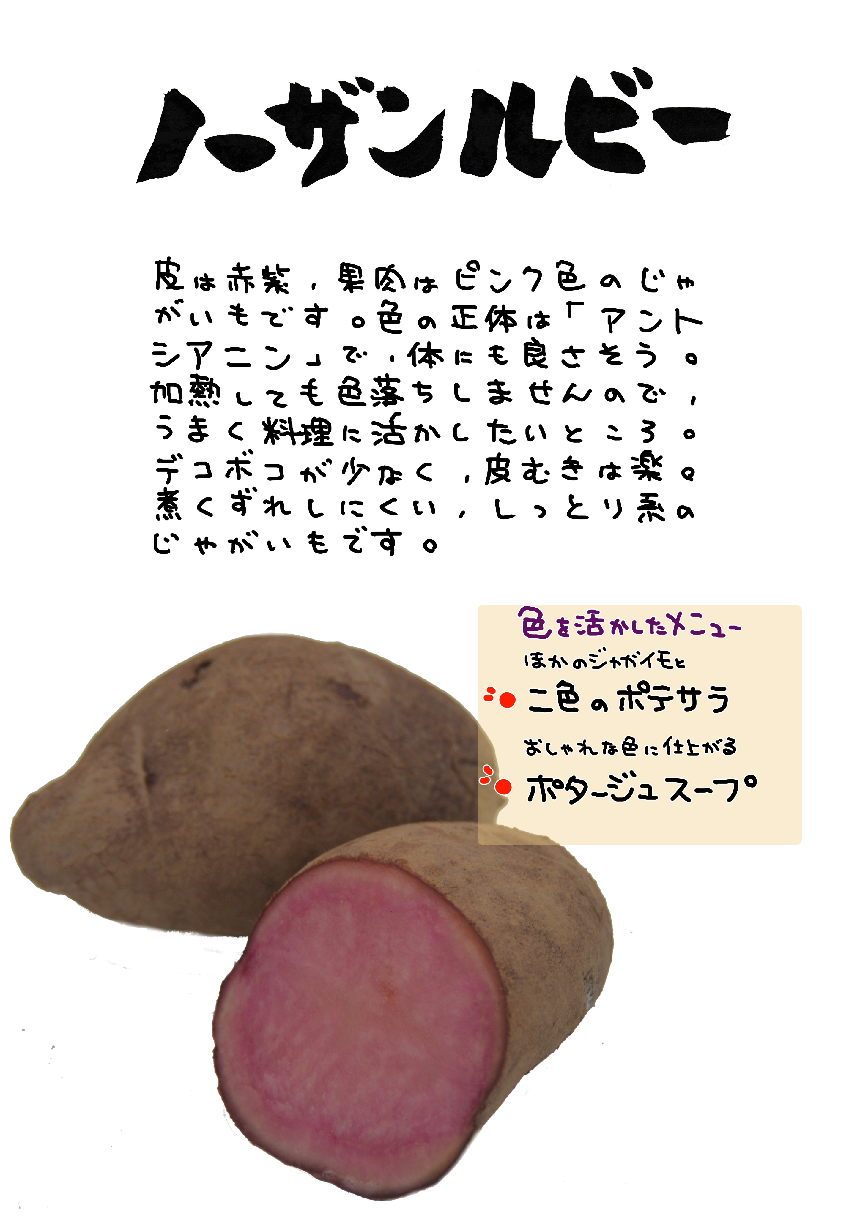 第一世代が、「インカレッド」とすると、「ノーザンルビー」らは赤肉じゃがいも期待の第二世代にあたります。