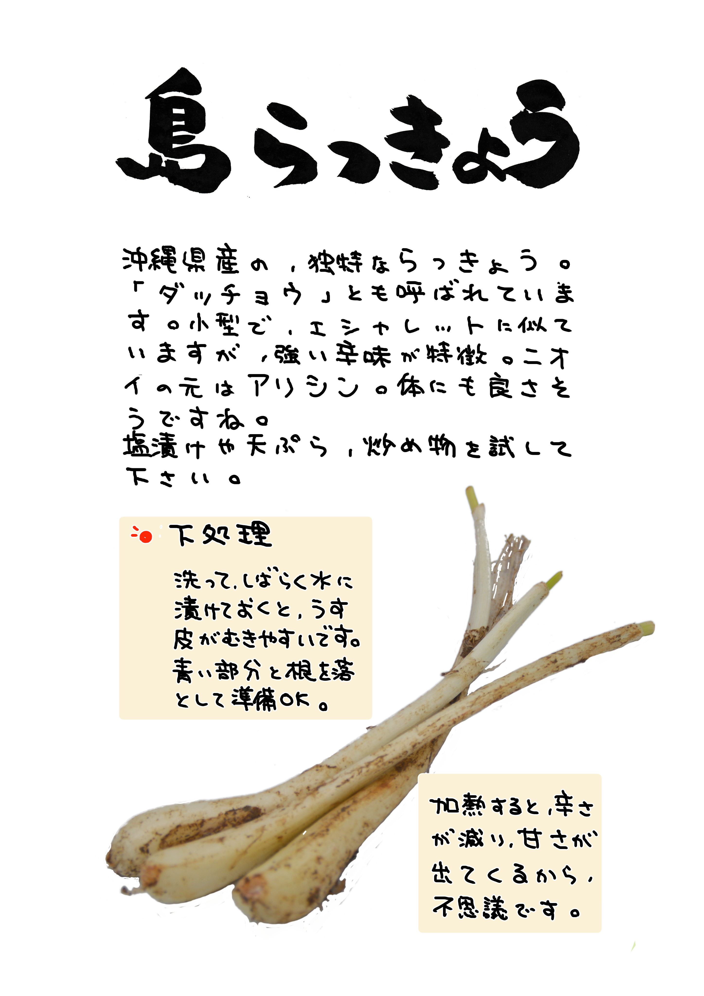 「島らっきょう」は、分類上「らっきょう」ですが、気候が特有の性質をもったものにするのでしょう、小型で香りが強いです。早どりするので、鱗茎は小さめ。伊江村(本島 西の島)や宮古島市(本島の西南),糸満市周辺(本島南端)が主な産地。