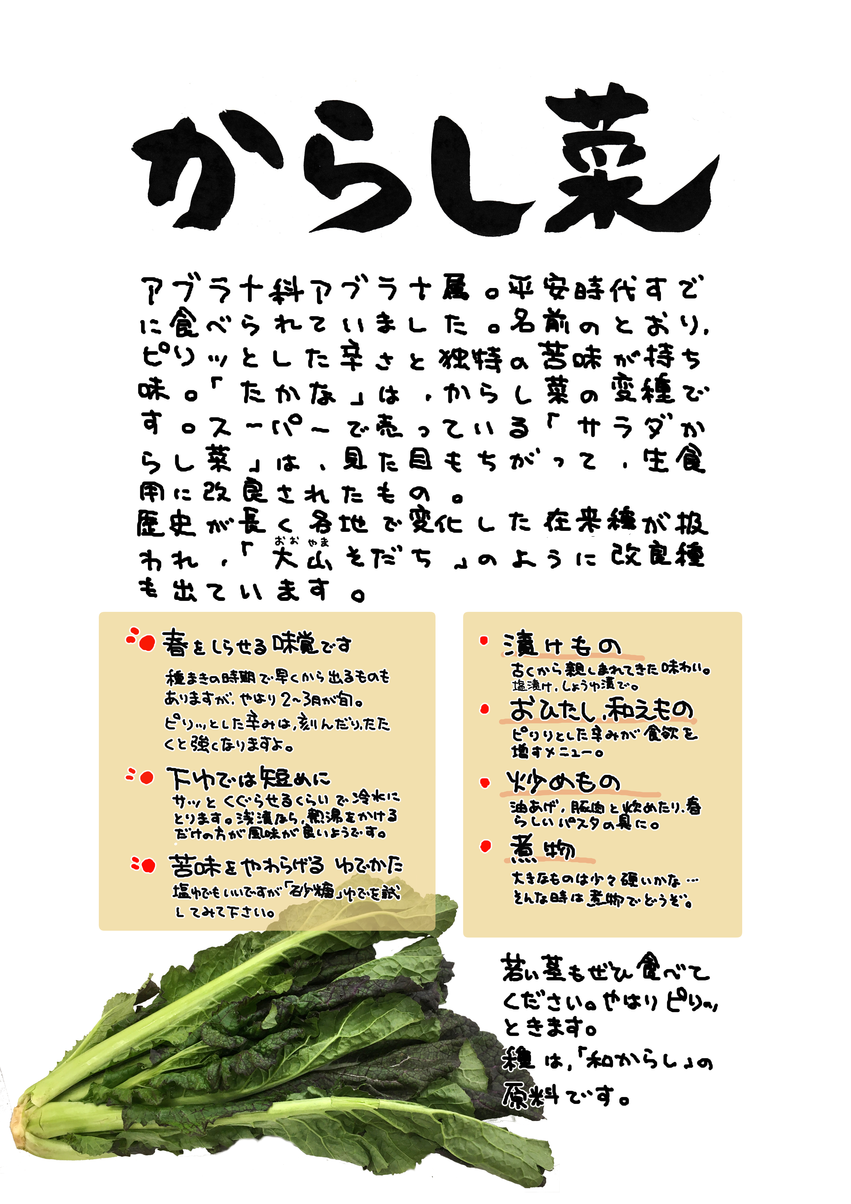 アブラナはとくに色々あって、タカナなど近縁との区別がゆるくなります。直売所でも、たくさん出てきますよね。アブラナは害虫も好物。春らしい味わいって、やっぱりいいです。害虫も少ないし。