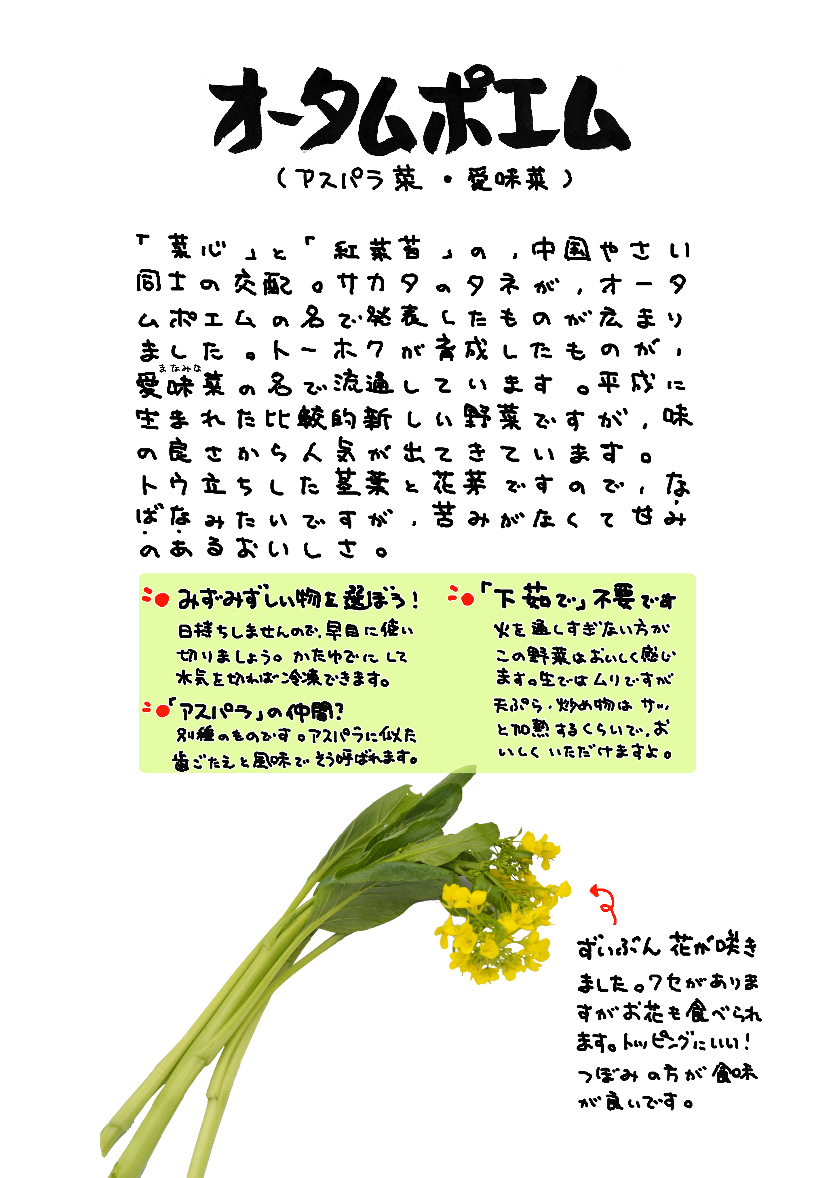 アスパラに似たふうみの野菜。なのはな のひとつと言ってもいいと思いますが、ここではある独立した品種としています。