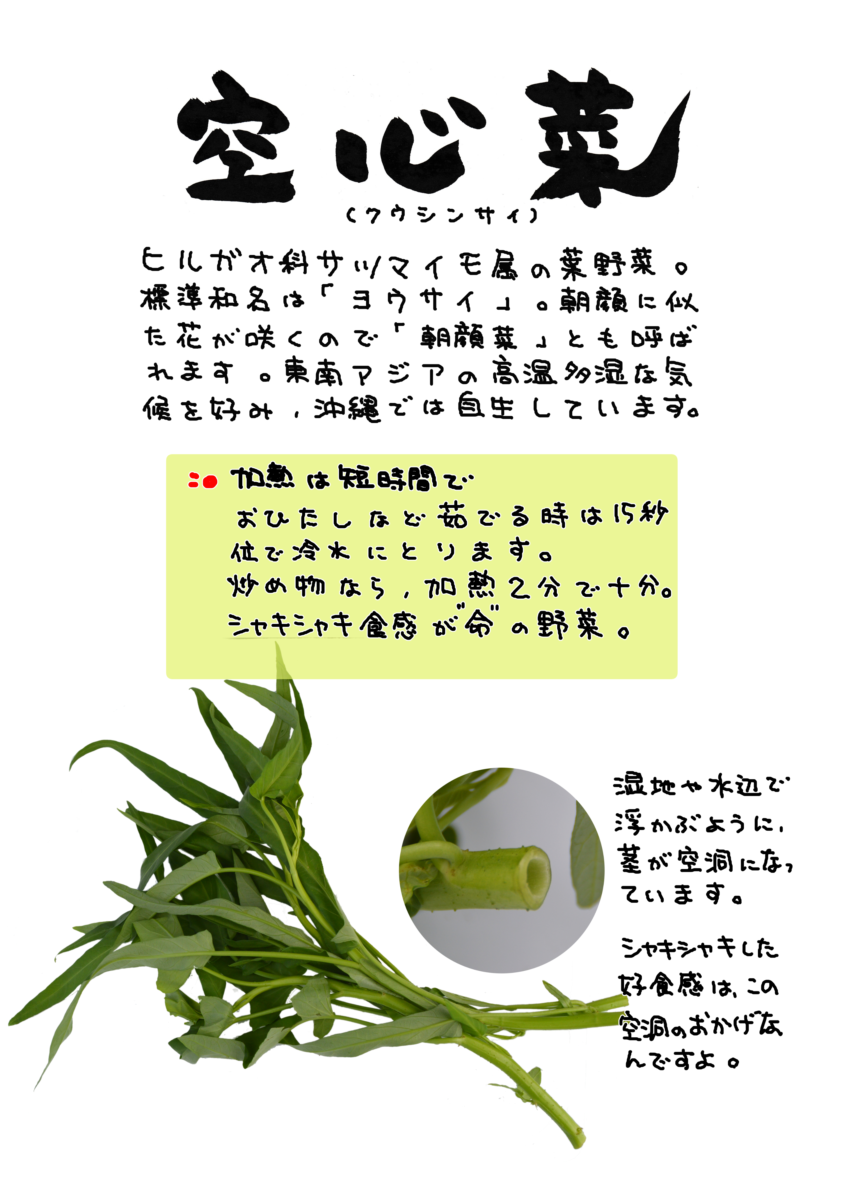 標準和名である「ヨウサイ」だけでなく、「空芯菜」(芯の字)ともに、なぜか商標登録されています。どういう人(組織)なんでしょう。その意図もわかりませんが。一般の通り名は、「空心菜」と思っていいと思います。