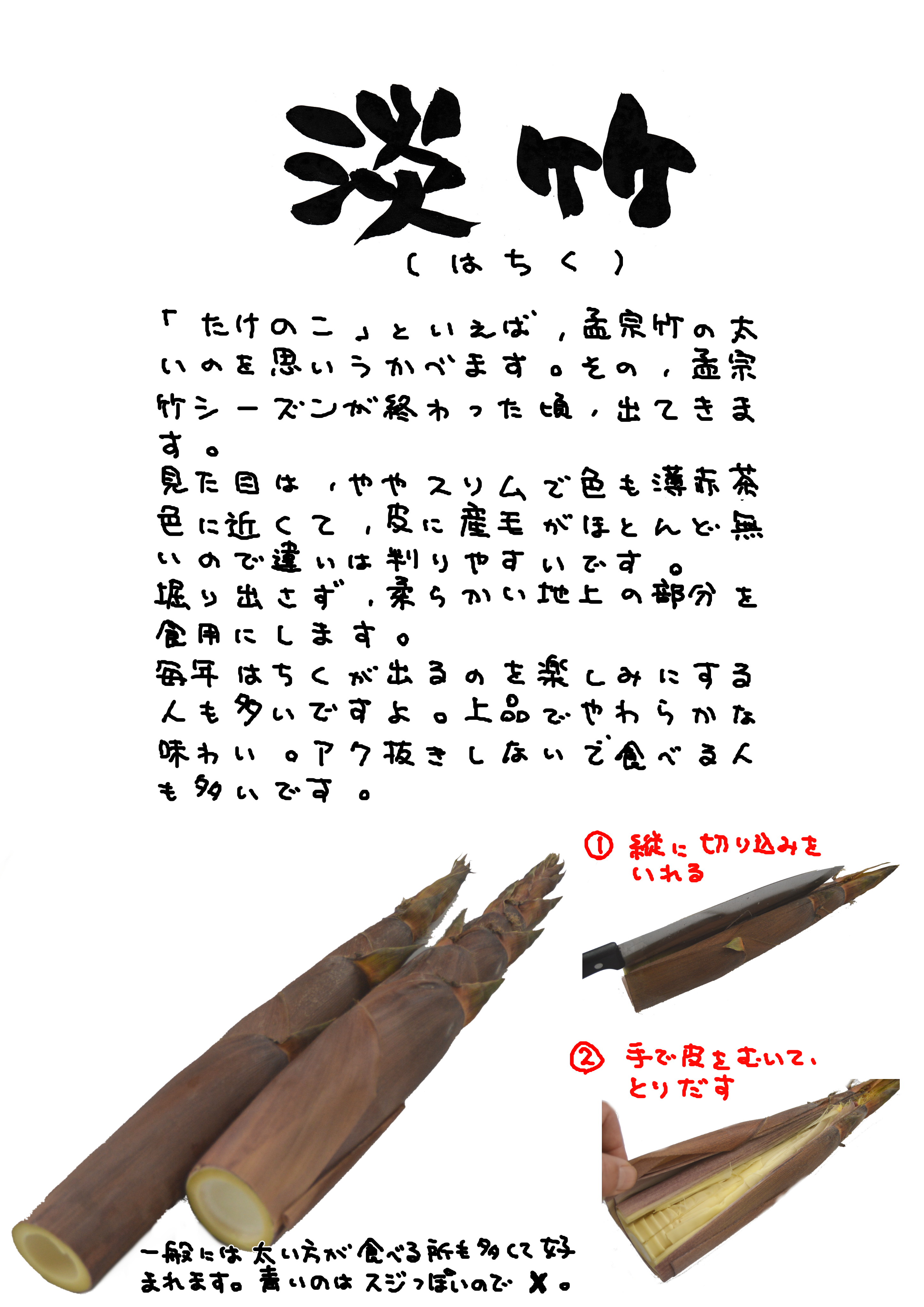 たけのこの場合は、斑紋がなくて、うぶ毛がごく少なければ「淡竹」。
