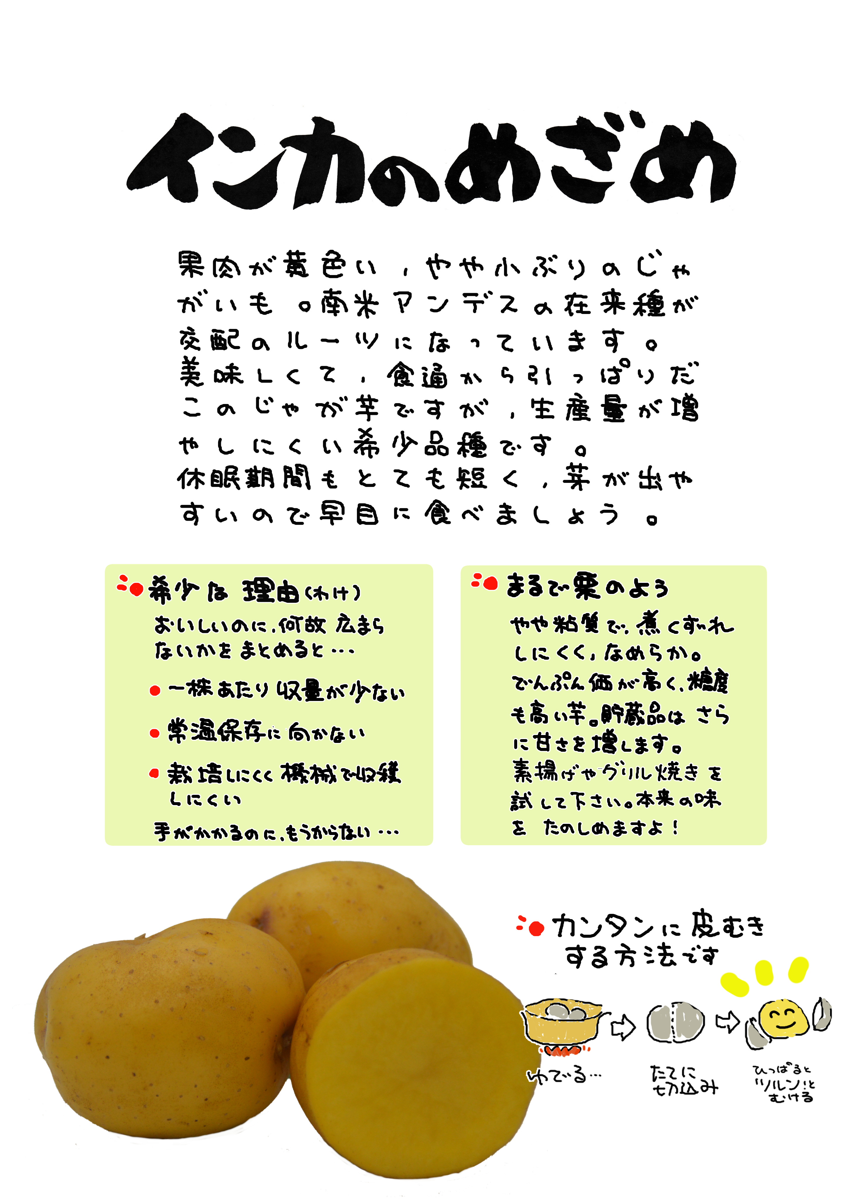 いずれにせよ、インカ帝国のあった、アンデス品種由来ということ、新しくリリースした品種ということで、「インカ」の「めざめ」と名付けられたようです。
