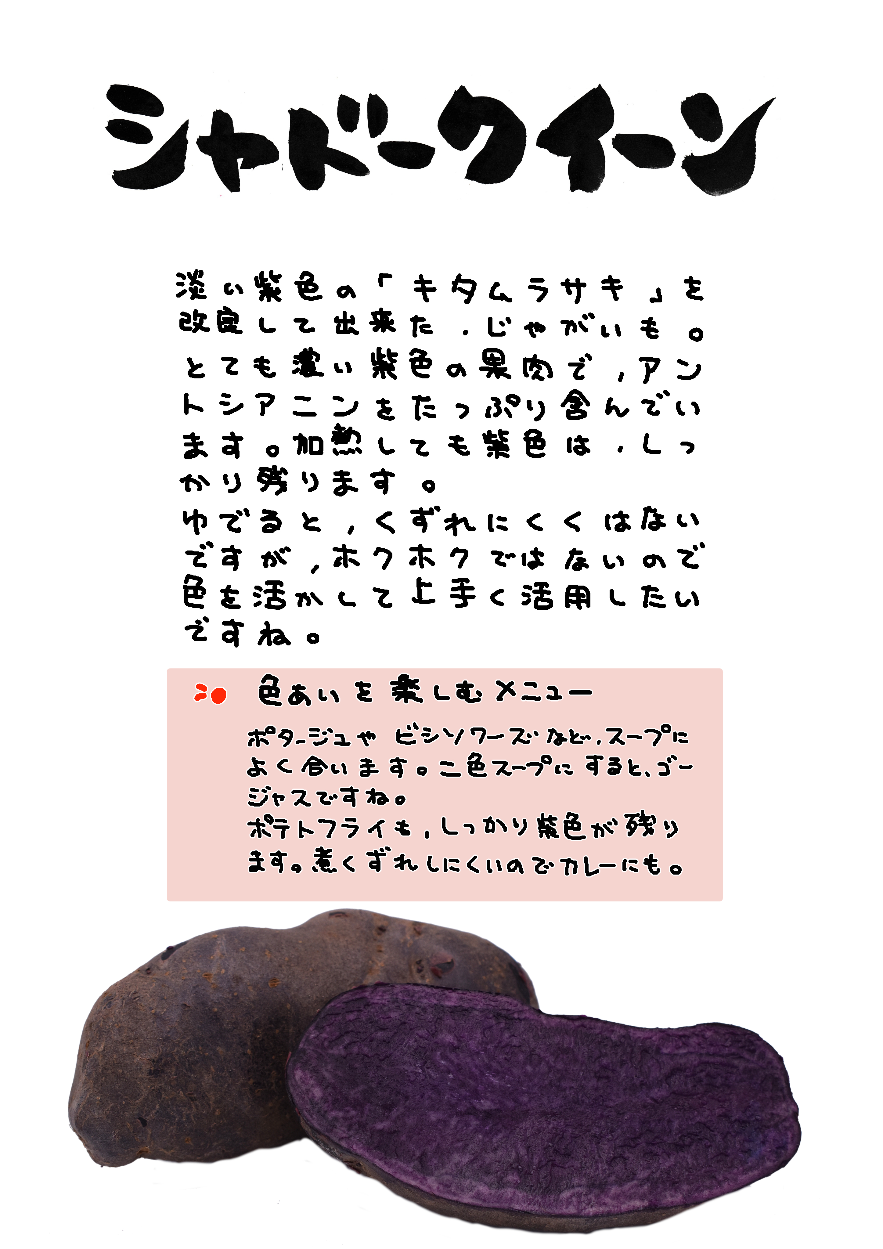 「ノーブルシャドー」は改良種で、「シャドークイーン」にはない、ジャガイモシストセンチュウ抵抗性があることから、今後産地では注目されるかもしれません。