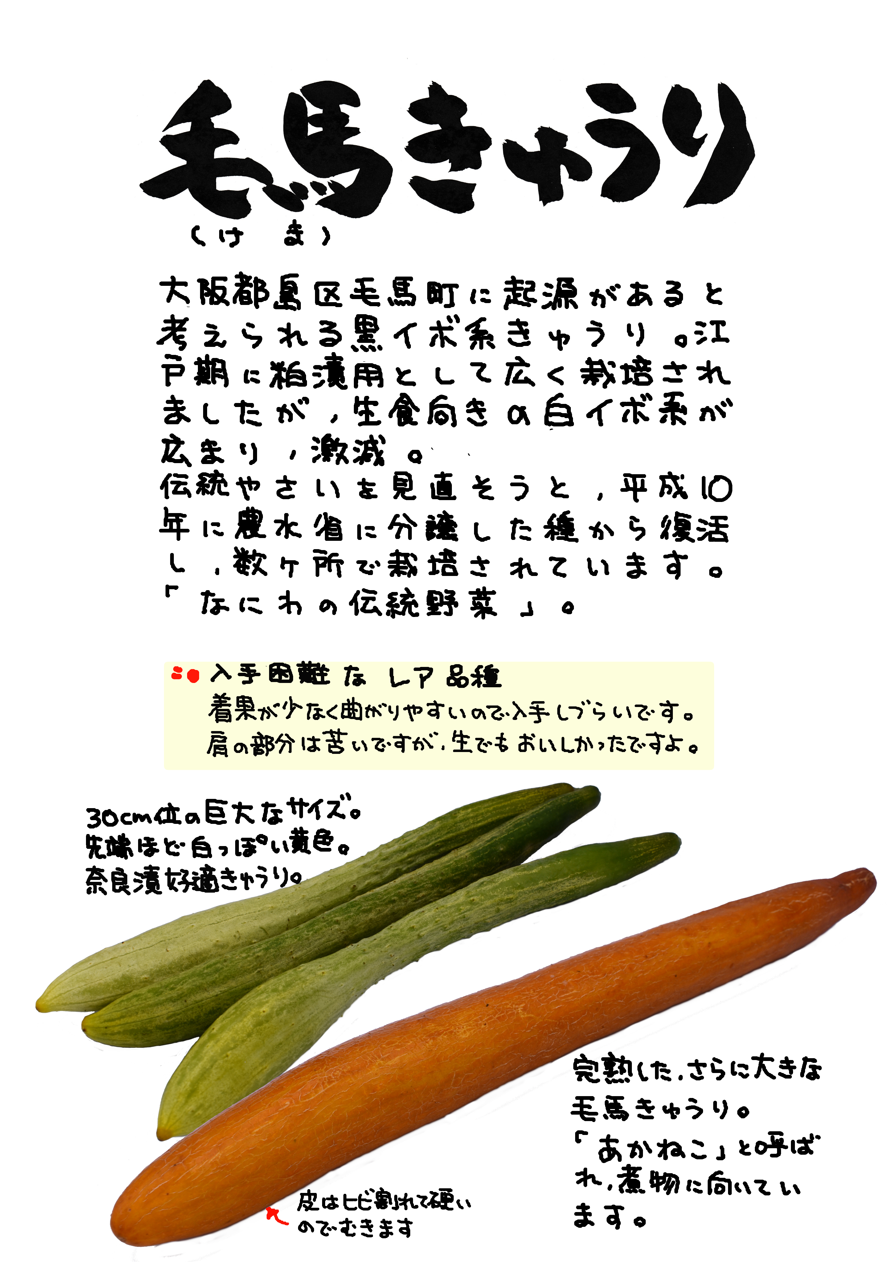 大阪都島区 『なにわの伝統野菜 「毛馬キュウリ」ものがたり』 に詳しい記述があります。興味ある方はぜひ読んでください。昭和28年には交雑2品種が流通。固定種は自家用に残っている可能性があるようです。原原種が農水にあったんでしょうか。